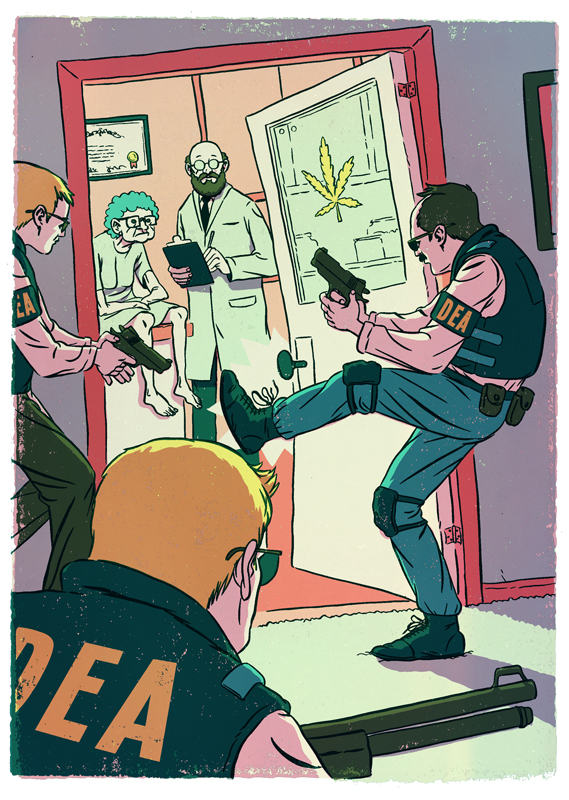 I was contacted a few weeks back by the A.D. who hired me for Harper’s about a year ago. He was doing some A.D. work for High Times Magazine and hit me up for this little ditty. I’m very on the fence with the legalization of marijuana. I don’t personally like the stuff and very few people outside of Snoop Dogg and George Carlin ever gain any kind of genius while smoking, but if its your thing and it makes you happy, go for it! To me, it’s synonymous with drinking. I prefer a drink when relaxing and I rarely become genius while tipsy (or sober). Where I identified with this article was in the hypocrisy of the situation. After California had stated that medical marijuana clinics would be considered a legitimate business, our government suddenly decided that it wasn’t legitimate. Then they started shutting places down and arresting people. I’m sure there are all sorts of gray areas, but the fact that people were getting busted for doing what they were told was okay to do is WAAAAYYYYY LAAAAAAAME! So here is my depiction of our law enforcement going way over the top to bust people who legitimately use marijuana as a medication. It was the AD’s idea to turn the patient into a little old lady. It was a great suggestion! I decided to make her look like my great grandmother Elsa. Alright all you Hulkamaniacs, say your prayers and take your vitamins and I’ll see you next week!