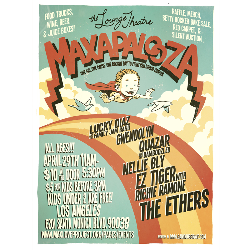 Audra has organized a music event in order to raise money for St. Baldricks, a foundation dedicated to fighting childhood cancer.  Audra’s son Max is currently duking it out with cancer so the event has been named for him, Maxapalooza!  I was very excited to work on this poster and I will be sure to get as many friends as I can to go.  This poster is for a really good cause and I always want to be apart of something good.  I also expect the three people who read my website updates be there!  Here is a link for more info: www.maxloveproject.org/pages/events.  For $10 bucks there will be a bunch of bands and it should be a really good time.