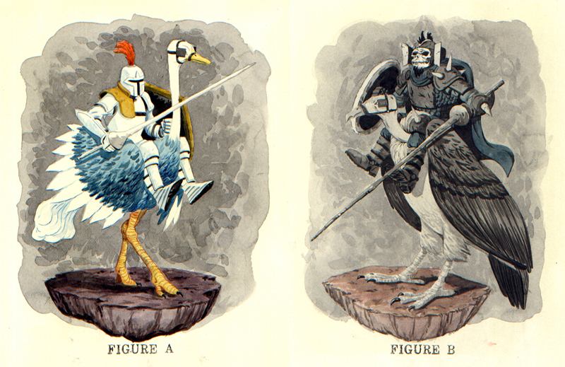 Joust was a game that I remembered playing for hours on end. A player controlled a knight piloting a flying ostrich to defeat evil knights flying vultures. But slaying an evil knight was not enough, because the evil knight would always drop an egg that would hatch into a furious and frenzied doppelganger of himself who was much more difficult to slay. The only solution was to reach the unhatched evil baby and stomp it to pieces. Take that evil baby! In addition to this complex plot line, players had to also avoid death by not venturing too close to a lava pit from which spawned a giant hand of magma trying to pull its victims to a fiery grave and from a pterodactyl made of lava (By the Gods! What manner of beast be thee?!) who reared its ugly invincible head when players lollygagged on a level. In two player mode, alliances were made and easily broken when one player may or may not have “accidentally” skewered his ally. Figure A, clearly my vision of the crusading white knight, and Figure B, my idea of the evil black knight inspired by General Kael from “Willow”. Ahhh, Joust. I love thee and I wish that your iPad version had better controls.